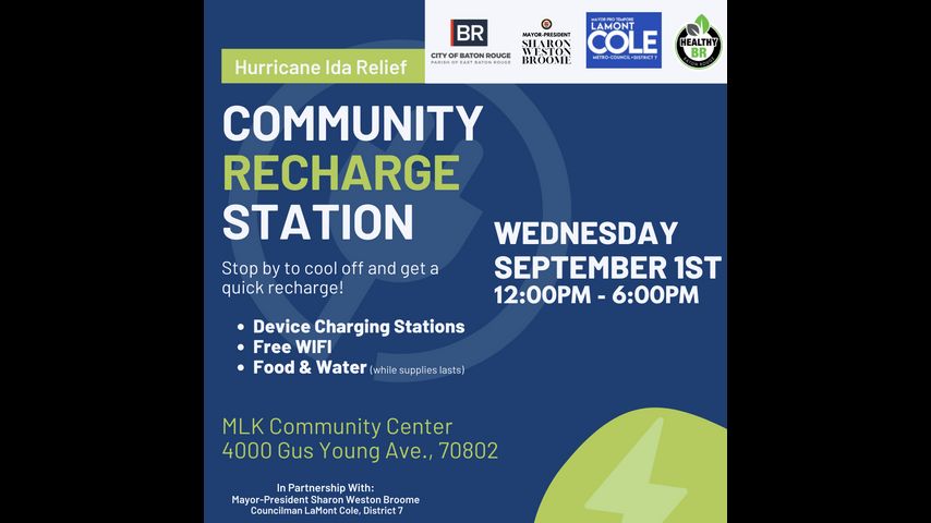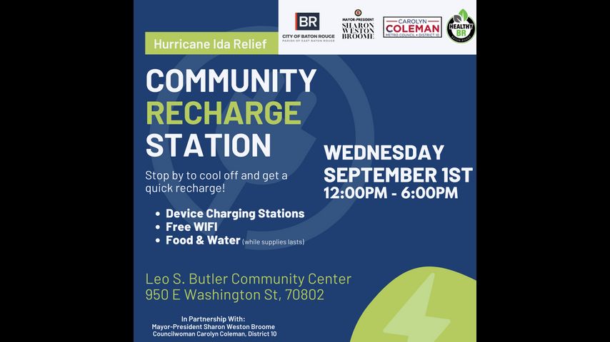 BATON ROUGE - The city of Baton Rouge will open two locations Wednesday, September 1st, where residents can charge their devices and pick up food and water.