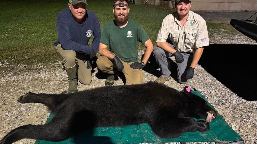 The bear was driven away in a trap around 8:30 p.m. and relocated to a wildlife management area. According to the state Department of Wildlife and Fisheries, biologists tagged the male bear before taking blood and fur samples.