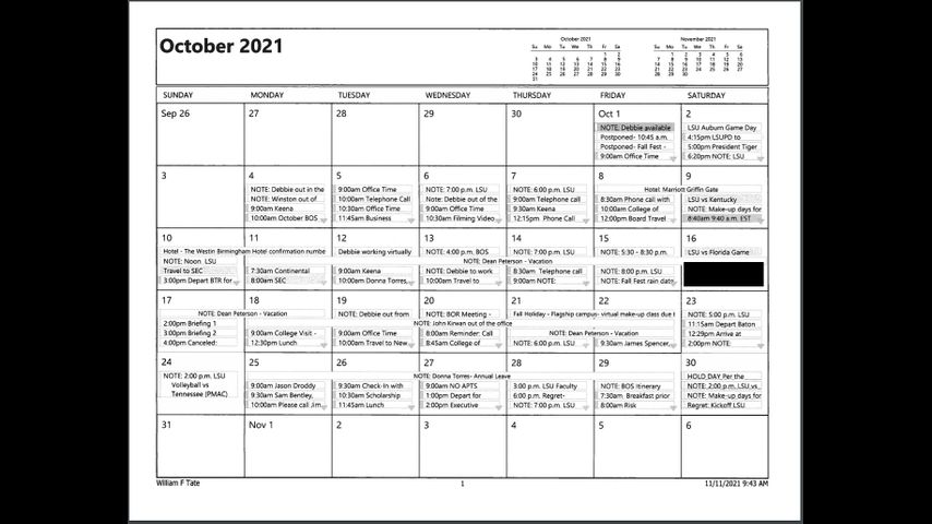 Tate’s schedule is chock-full of meetings nearly every day. His life is crammed with phone calls, “office time,” luncheons, travel to New Orleans and numerous breakfast meetings. Details about each day were made available to WBRZ except the afternoon Orgeron was fired. Unlike days where the calendar listed “telephone call” or “depart for [a location],” meetings on October 16 were redacted.