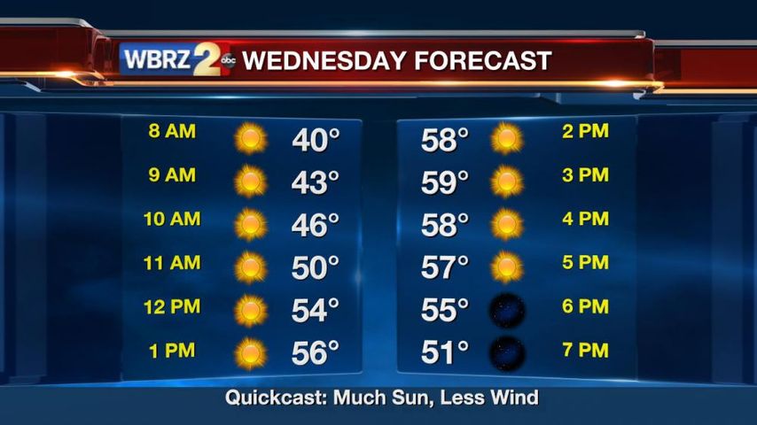 Today and Tonight: Your Wednesday will be peaceful with winds slackened and sun shining. High temperatures will warm into the upper 50s. Overnight won’t be as chilly as previous nights. We’ll project a low around 40 degrees under clear skies.