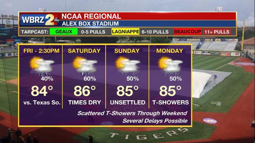 The LSU Baseball team will be hosting the NCAA Regional at Alex Box Stadium this weekend while the unsettled weather pattern continues. Scattered showers and thunderstorms will be around for game one at 2:30 Friday Afternoon—and that forecast remains the same through the weekend. The LSU Tarp Crew may have several “pulls” to handle this weekend as LSU and other visitors wait out several delays.