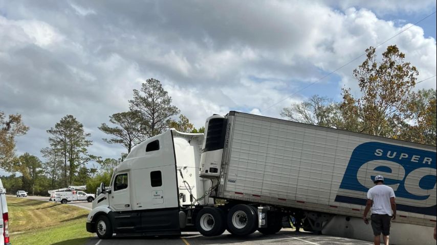 The 18-wheeler's trailer appears to have drifted off of the road as Blood River Road began to curve. The truck was perpendicular to the road and blocked traffic.
