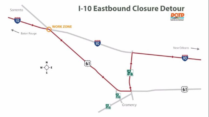 During the closure, motorist driving eastbound on I-10 must exit onto US Hwy 61 then proceed to LA 641 to get back onto the interstate.