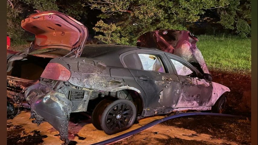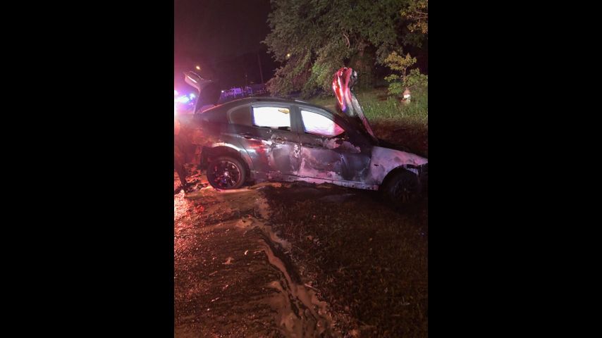 When authorities arrived on scene around 8:30 p.m., officials say they found a car engulfed in flames and crashed in a ditch.