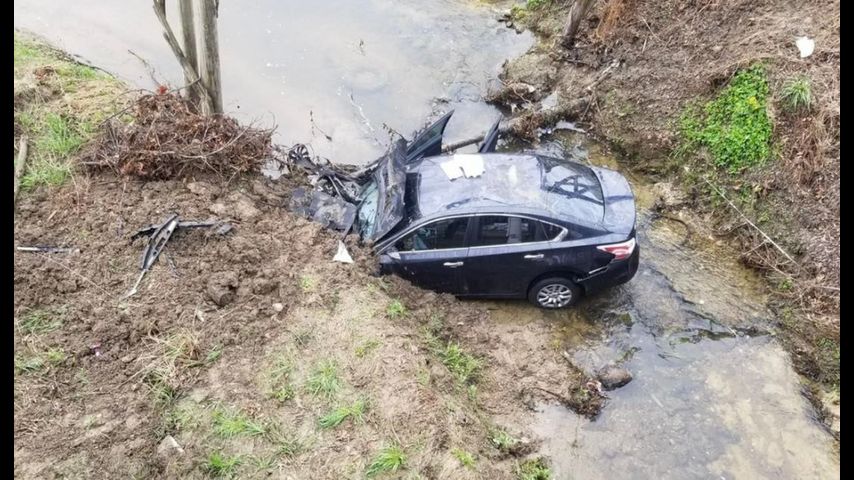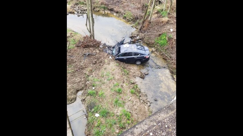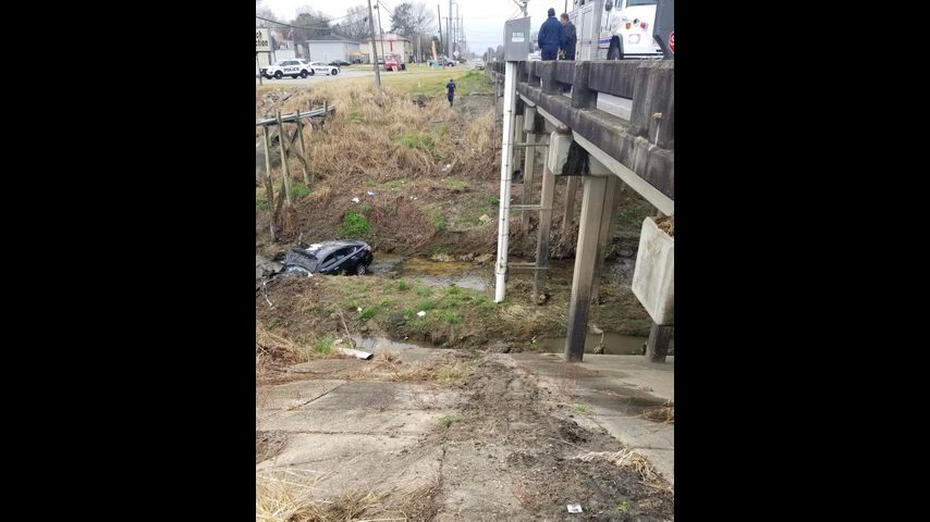 The Baton Rouge Fire Department said the car rolled down a steep embankment along Old Hammond Highway near Boulevard De Province and came to a rest upright in about a foot of water.