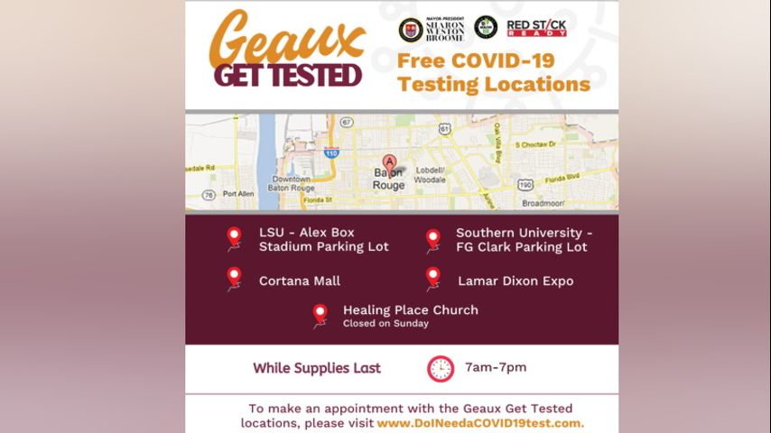 BATON ROUGE - East Baton Rouge Mayor-President Sharon Weston Broome is encouraging members of the public to take advantage of her "Geaux Get Tested" initiative by getting tested for COVID-19 at one of the five drive-thru testing sites she and collaborators have set up across the Parish.
