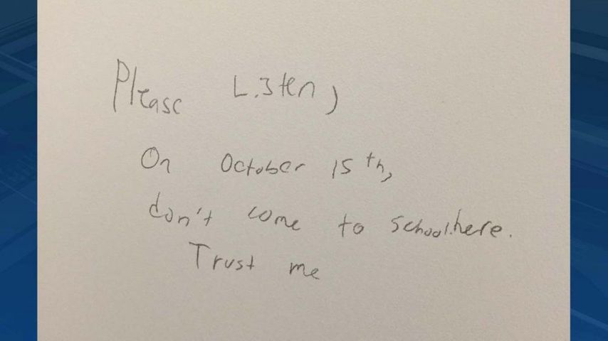 The note reads: “Please Listen, On October 15th, don’t come to school here. Trust me”.