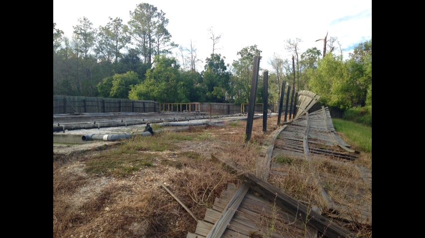 A fence around Mo-Dad Utilities, LLC wastewater treatment facilities fell down in April and has not been repaired. Inside are large pools of water with pumping stations.