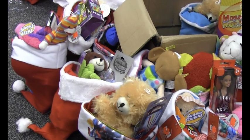 The signage promotes the "5th Annual Toys, Tots & Turkeys" giveaway. It shows a date of December 23 -- but the event was in 2021 and is not happening this week.
