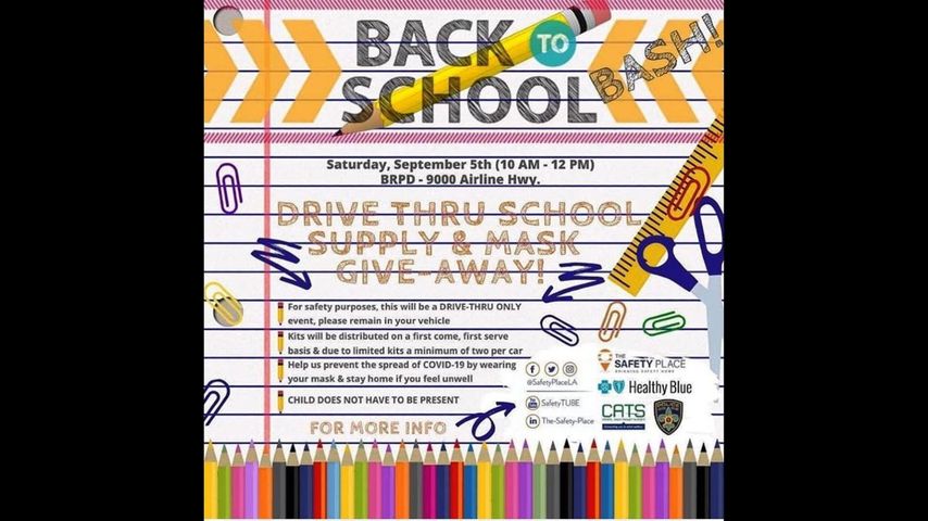 The Safety Place, Healthy Blue and CATS will all host the Drive-Thru Back to School Bash with the help of BRPD. The donation drive will offer 600 free school supply kits for different grade levels.