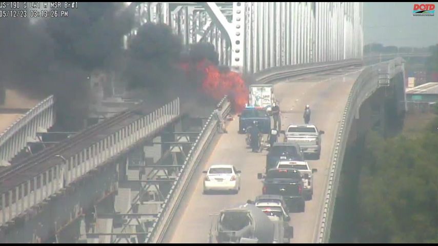 Burning car shuts down eastbound traffic on US 190 at the Old Bridge