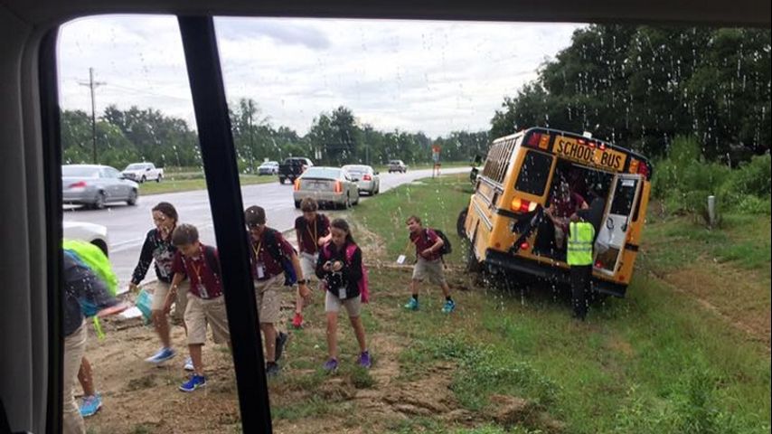 Witnesses said the bus went off into a ditch at Wisteria Lakes Drive and Sullivan Road. Social media posts showed children leaving the bus through emergency exits.