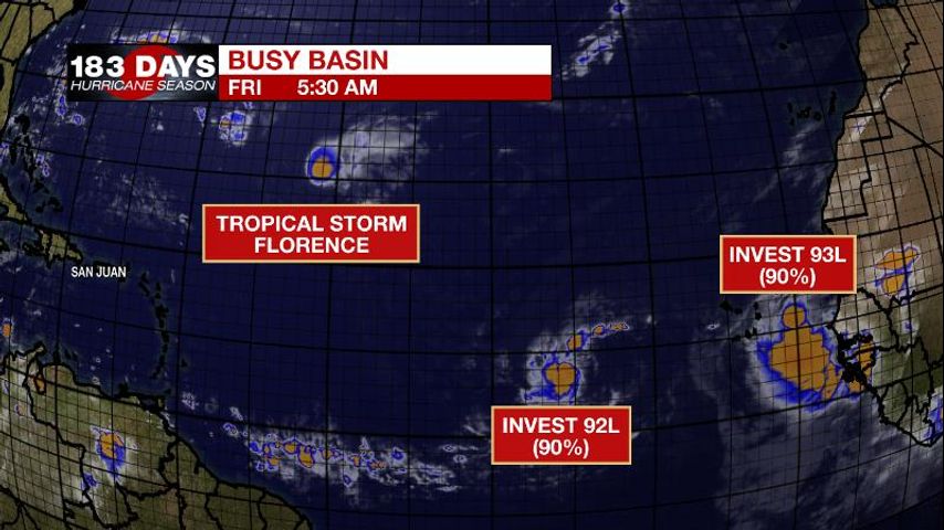 The Tropics: The Atlantic Basin is rather busy as we near the climatological peak of hurricane season (Sept. 10). Florence has weakened into a tropical storm within a very harsh environment. However, the system will survive and likely gather strength once again as it moves over warmer water. Forecast model guidance agrees that Florence will become a major hurricane again. There is disagreement as to track with a large spread of possibilities from a curve out to sea to an East Coast landfall. North Florida to New England need to continue to monitor this system. Two other tropical waves in the far eastern Atlantic are very likely to become Helene and Isaac. While it is far too early to tell if these systems will threaten the U.S., forecast models indicate a little more attention should be paid to Invest 92L which is pegged to take a more southern track toward the Leeward Islands.