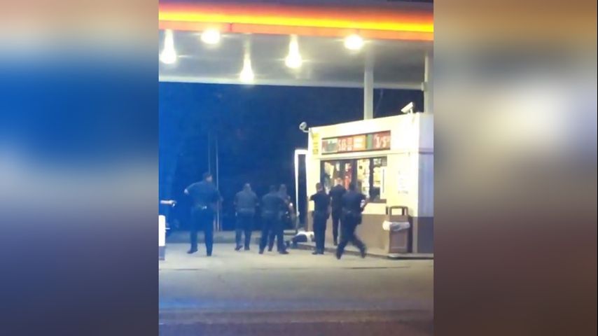 The footage shows police open fire near the entrance of the convenience store and the man lying on the ground shortly after.