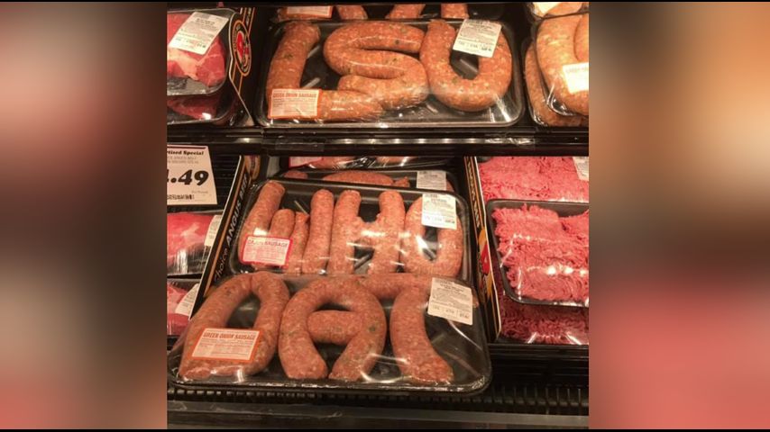 A post on social media shows sausages contorted to read 'WHO DAT' and 'LSU' among the frozen meats at the Rouses on Johnson Street in Lafayette.