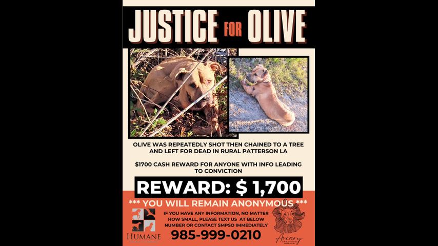 Local groups and the Humane Society of Louisiana are also offering a $1,700 reward for information leading to the arrest and conviction of those responsible for Olive's death.