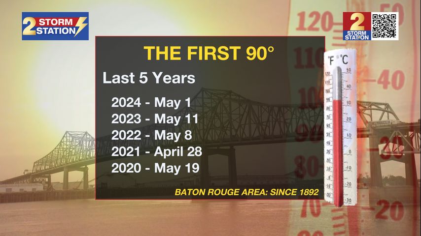On Wednesday at approximately 2pm, Baton Rouge Metropolitan Airport reached an air temperature of 90 degrees for the first time in 2024. This comes in the midst of a stretch of well above average temperatures for the Capital Area. Highs in the upper 80s and low 90s remain possible through much of the Storm Station 7-Day Forecast. CLICK HERE for the latest.