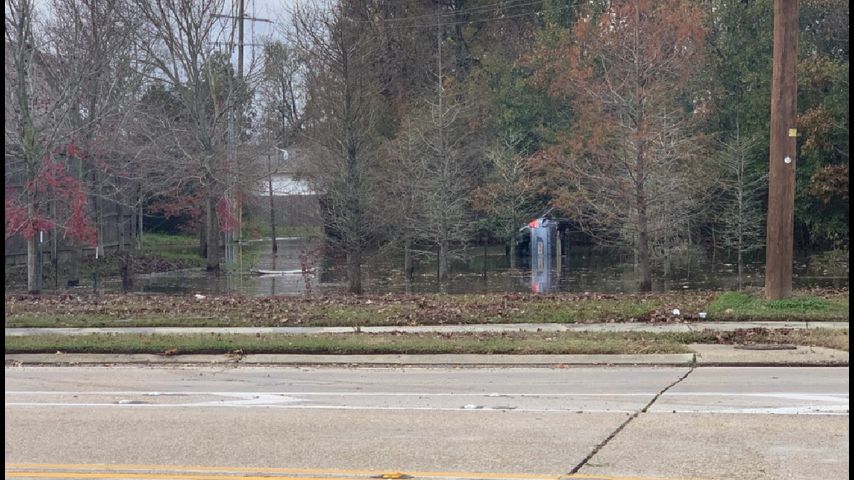 Photos from the scene show an overturned vehicle partially submerged in the ditch.