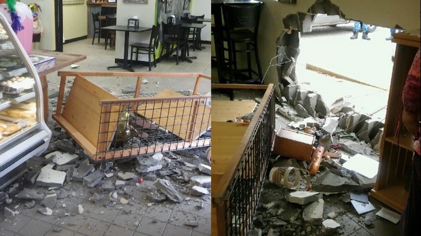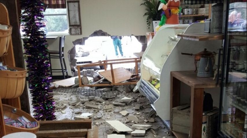 No one was hurt when the car drove through the building and only one other person was inside the store. Bakery owner Debbie Daigle says her employee remained "very calm" and was "concerned about the king cakes in the oven."