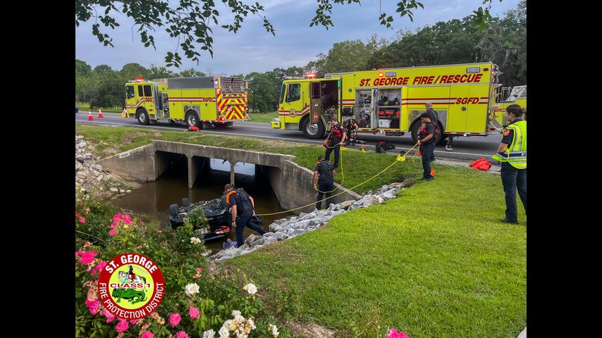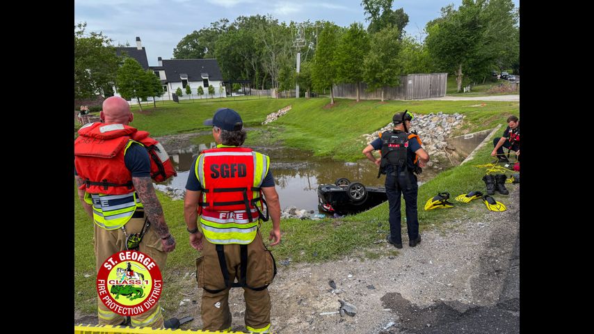 Pictures from the St. George Fire Department showed a car crashed into the pond in front of the Valhalla subdivision. The bystander who called in the crash said they didn't see it happen.