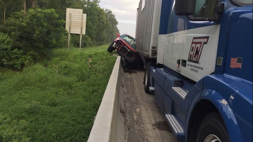 Images showed the red car sandwiched and crushed between an eastbound I-12 barrier and the truck.