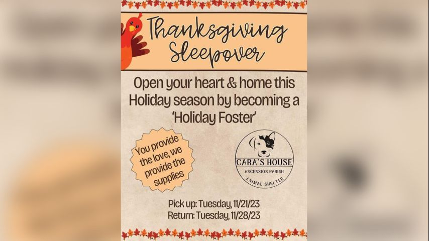 SORRENTO - Cara's House, the primary animal shelter serving Ascension Parish, is seeking families to host homeless pets over Thanksgiving weekend.