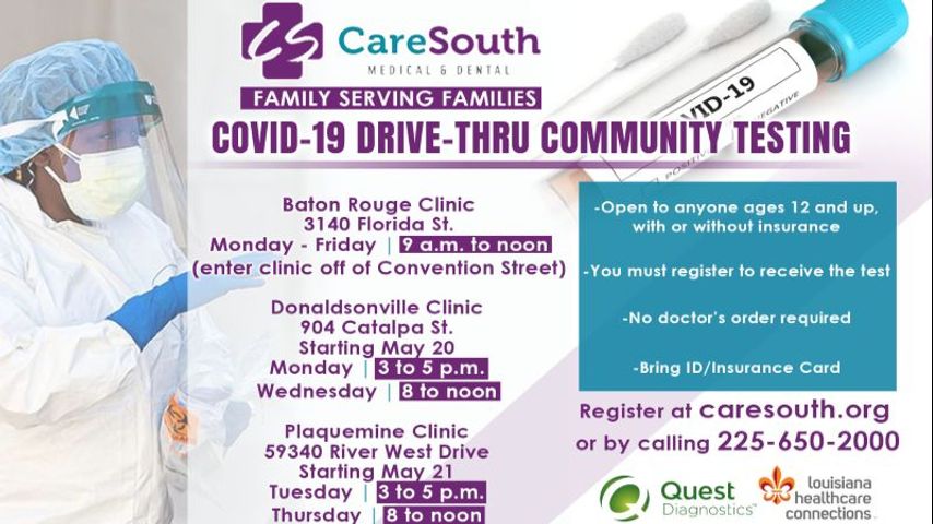 With the help from the Louisiana Healthcare Connections and Quest Diagnostics testing will also be available on May 20 in Donaldsonville and May 21 in Plaquemine.