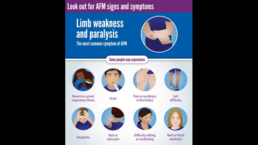 Signs of acute flaccid myelitis include difficulty walking, weakness of the limbs, back pain or neck pain. Those with AFM may experience some respiratory symptoms or fever as well.