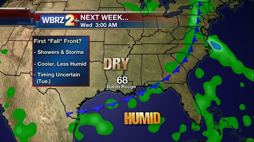 Up Next: Over the weekend, above average temperatures will continue with highs in the low 90s and lows in the low 70s. Afternoons will feature partly sunny skies and only isolated showers—with considerably lower rain chances away from the coastal parishes. Early next week, we’ll be tracking a cold front sliding eastward across the country. Right now, it is unclear whether or not this front will fully clear the area and bring cooler temperatures and lower humidity. There is better confidence that in its slow approach, rain and thunderstorm activity will increase into midweek.