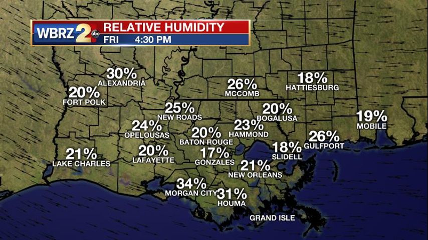 The Next 24 Hours: Winds once again make for a challenging low temperature forecast. Clear skies and very dry air would normally create ideal cooling conditions overnight. However, elevated winds out of the northwest may stop maximum cooling. Lows will likely bottom out in the low to mid 30s for most neighborhoods. Saturday will be sunny with highs temperatures in the mid 50s. Winds will stay out of the west-northwest at 10-15mph. If you find yourself reaching for the lotion and chap stick, it is because the air is extremely dry. Daytime relative humidity will be around 20-30 percent. These two features make favorable conditions for fire ignition and spread so it would be a good idea to reconsider outdoor burning, including bonfires. Additionally, the strong winds will make for a rough, choppy days on the lakes and Gulf.