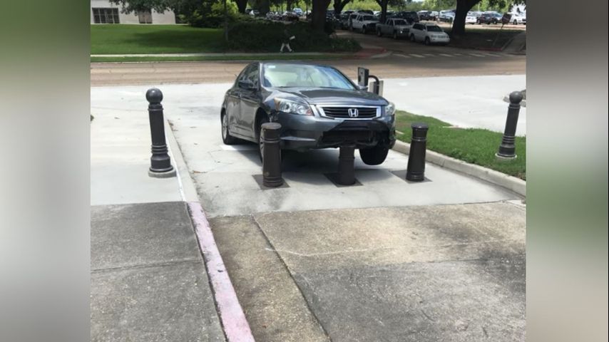 The bollards activated as a sedan was crossing over, pushing the car up, tearing off its bumper, mangling the side and leaving the car teetering partly off the ground.