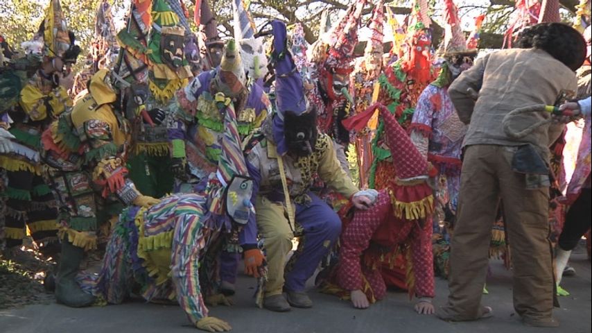 The masked men wearing colorful costumes sing and beg for money and food to keep the tradition alive in Acadia Parish. Then chickens are released and the masked men give chase.