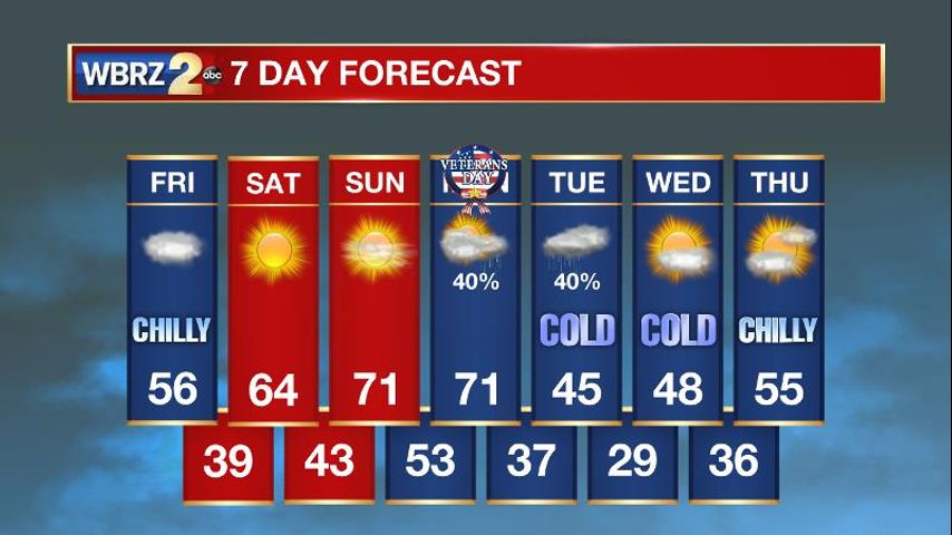 Up Next: Cool and dry conditions are anticipated for both the LSU and Southern football games on Saturday afternoon. Expect a pair of sunny weekend afternoons in the mid 60s to low 70s. An even colder air mass will then race into the region next week. A cold front will bring clouds and showers late Monday into early Tuesday followed by sharply colder temperatures. Highs will struggle to leave the 40s on Tuesday and Wednesday. The first freeze of the season is likely on Wednesday morning, and a hard freeze is not out of the question. Historically, the average first freeze occurs on November 24. The earliest freeze recorded was October 28, 1957.