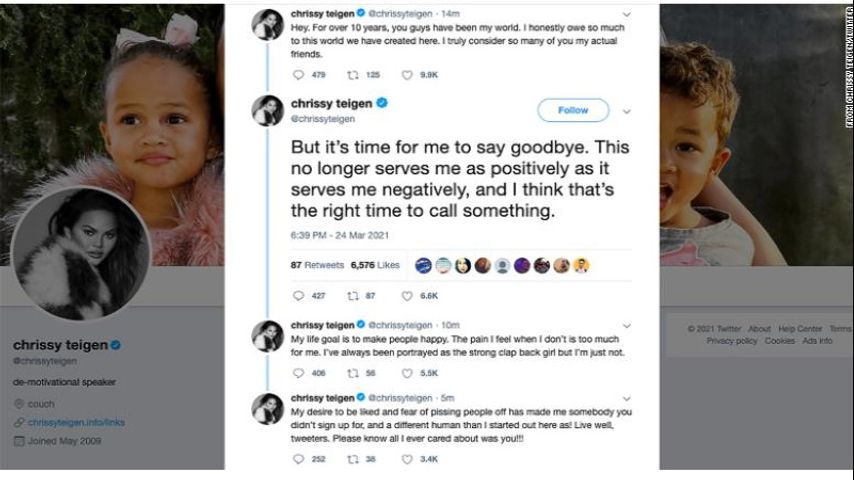 Chrissy Teigen deletes Twitter account, citing its negative impact on her life