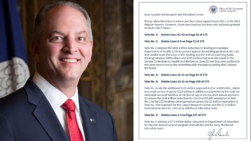 BATON ROUGE - Gov. John Bel Edwards used his line item veto powers on Thursday to strike what he called "painful" cuts from the budget given to him by the state legislature.
