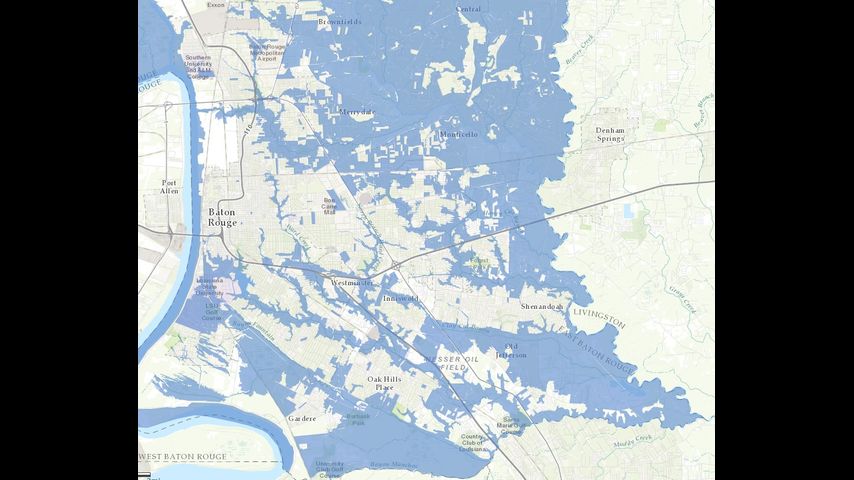 The map shows data inputs such as 911 calls, Baton Rouge Fire Department calls for rescue, 311 requests for flood-related service, City of Zachary damage assessments, FEMA flood hazard area data and street-level damage assessments. Based on the inundation map, more than 58 percent of East Baton Rouge Parish had been impacted by flood water over the past week.