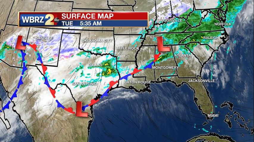 Up Next: A cold front will move into the region on Wednesday night, set to remove the unsettled weather by Thursday night. Prior to this, much of Wednesday will be quiet, although cloudy and muggy. A squall line is expected to form, pushing rain and thunderstorms into the Baton Rouge area Wednesday evening into early Thursday morning.