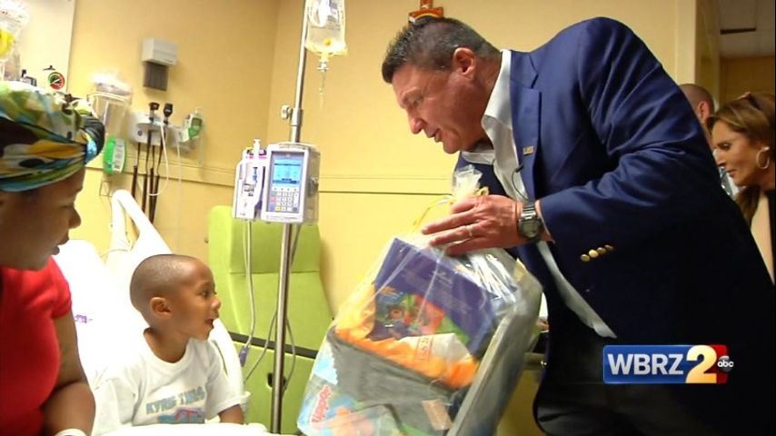 BATON ROUGE - Although his biggest game of the year is just over a week away, Coach Ed Orgeron and his wife Kelly spent Thursday with young patients at Our Lady of Lake Children’s Hospital, delivering baskets of hope to children who need it.