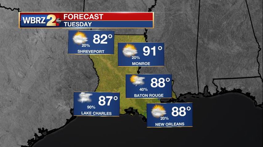 Up Next: While much cooler temperatures are found behind a cold front northwest of Louisiana, a weakening cold front running into warm and humid Gulf air will prevent that fall feel from reaching the Baton Rouge area. Wednesday is looking mainly dry, but a weak cold front lingering in the area means that rain chances cannot be set at zero. Skies will be mostly sunny with high temperatures in the upper 80s. High temperatures Thursday through Sunday will remain in the 80s, while lows only drop to the mid 60s at best. Humidity may come down just a little. Mostly clear skies are expected through the weekend.