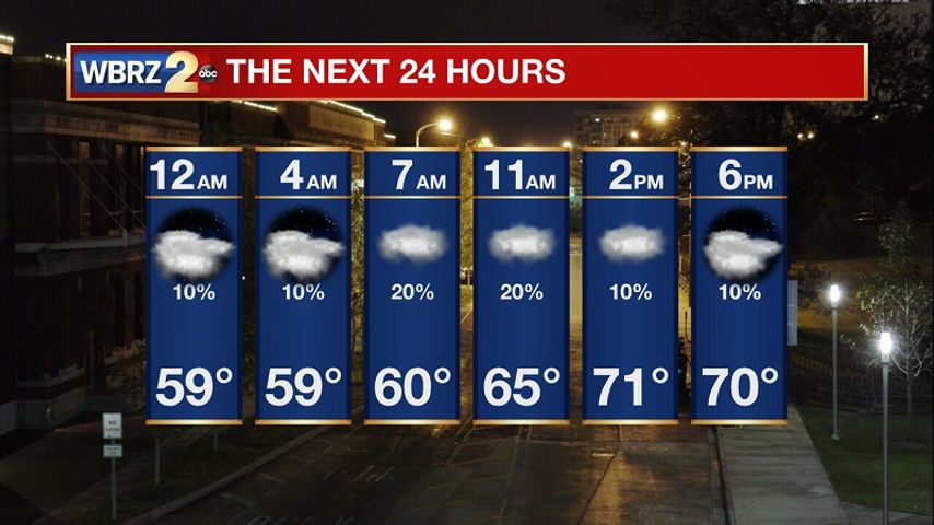 Tonight and Tomorrow: Tonight, expect mostly clear skies and calm winds. Lows will be in the low to mid 30s. Locations north and east of Baton Rouge could briefly touch freezing. Sunday, after a cold start in the morning, highs will warm into the low 60s under a mostly sunny sky.