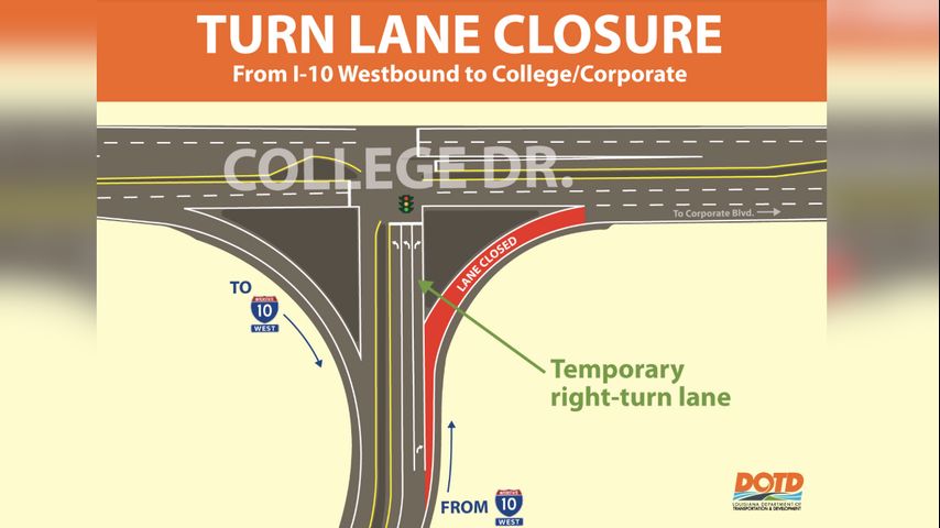A new temporary right turn lane will be opened at the College Drive exit traffic signal. This right turn lane will allow drivers to access Corporate Boulevard and northbound College Drive. The updated traffic signal will feature two dedicated left turn lanes and one dedicated right turn lane. Additionally, a second lane will be opened on the I-10 exit ramp to help traffic flow.