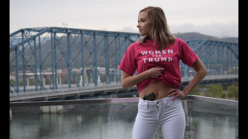 In the photo, posted Saturday, Brenna Spencer, 22, holds up the bottom of her “Women for Trump” T-shirt to reveal a handgun wedged into the waistband of her jeans outside a Tennessee museum.