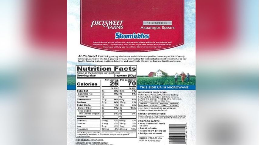 The Pictsweet Company is recalling 1,872 cases of Pictsweet Farms 8-oz Steams'ables Asparagus Spears, according to the U.S. Food and Drug Administration. Officials say that listeria monocytogenes is an organism which can cause serious and sometimes fatal infections in children, frail or elderly people, and others with weakened immune systems.