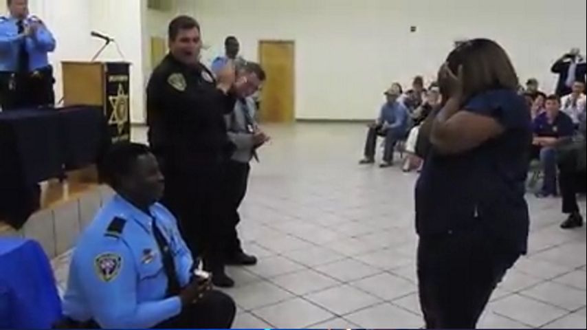 "With tears of joy trickling down her face, of course, she said 'yes,'" the department said on social media. "Sheriff Mike Tregre and several fellow officers were on hand to offer congratulations and best wishes to the happy couple."