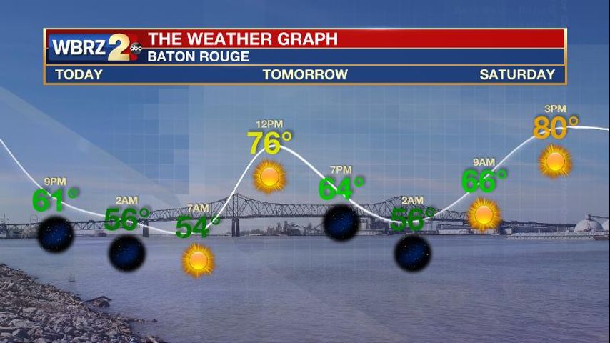 After That: As unseasonably warm high temperatures continue, some clouds may start to show up in skies on Saturday, but make no mistake; it will still be a nice day. On Sunday, a cold front will push into the Gulf South with band of showers possible immediately ahead of the front. Though chances are on the low end, any rain that can develop should be short-lived and light so a mainly dry weekend is ahead. Behind the front on Monday, a slightly stronger push of cool air could come into the region and allow temperatures closer to averages, which are 73 and 50 for this time of year, through Wednesday. CLICK HERE to view your complete 7-Day Forecast.