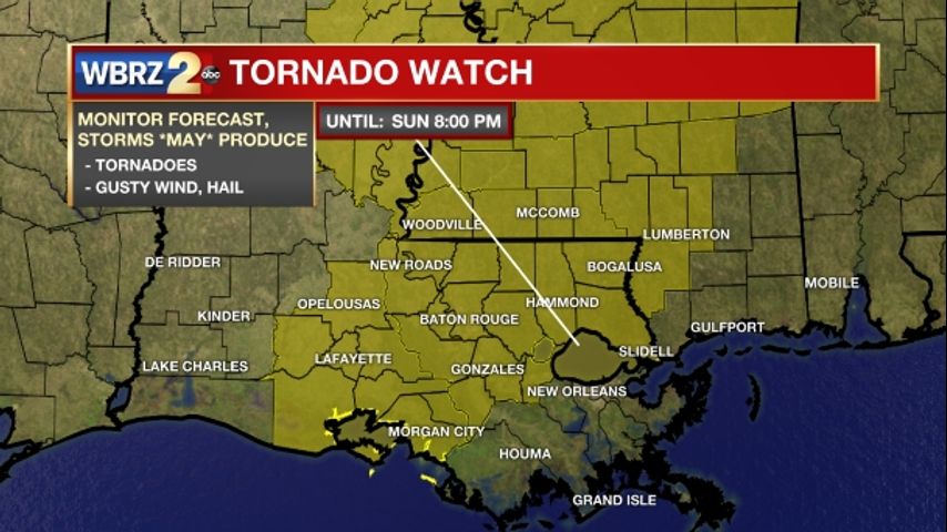*TORNADO WATCH* for the shaded area. We're tracking storms and will bring you warnings, if issued. #WBRZwx pic.twitter.com/1N3kZ0mUT2