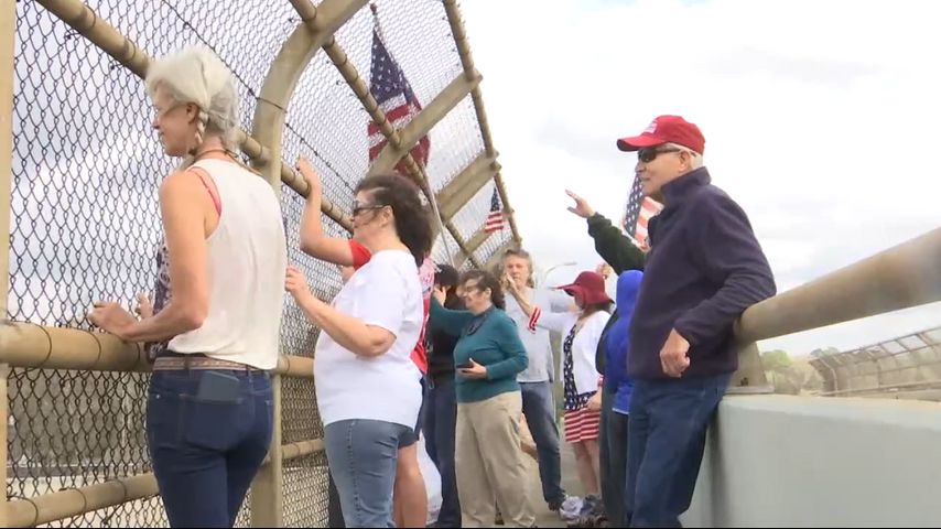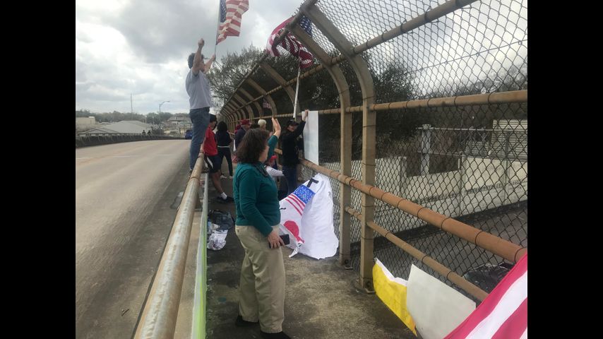 BATON ROUGE - More than a dozen Baton Rouge residents gathered on the Narin Drive I-10 overpass, waving American flags and displaying posters with words of support.