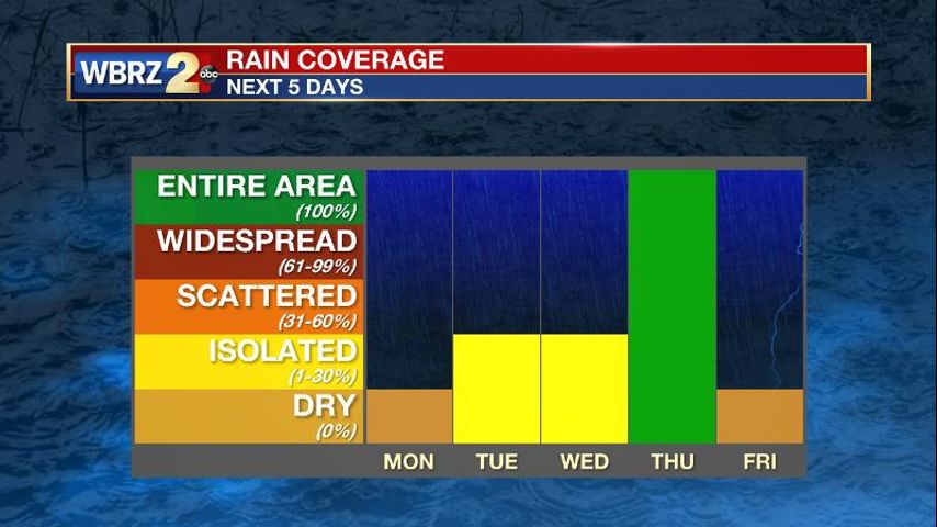 Up Next: A weak frontal system will bring some showers to the area on Tuesday, but thanks to more moisture availability along the coast, rain chances will be much higher closer to the Gulf and lower into southwest Mississippi. With mainly cloudy skies, a small range in temperatures is expected with most areas topping out in the low 70s. Wednesday will bring a break in the active weather as a stronger system develops in the western Gulf of Mexico. By Thursday, this area of low pressure will swing across south Louisiana leading to widespread rain. Fortunately, this storm will move just far enough south that any strong to severe thunderstorms should remain offshore. Some thunderstorms may occur as far north as I-10 though. By the end of the week, a cold front will sweep through the region leading to clear, dry, cool weather for Friday and next weekend.