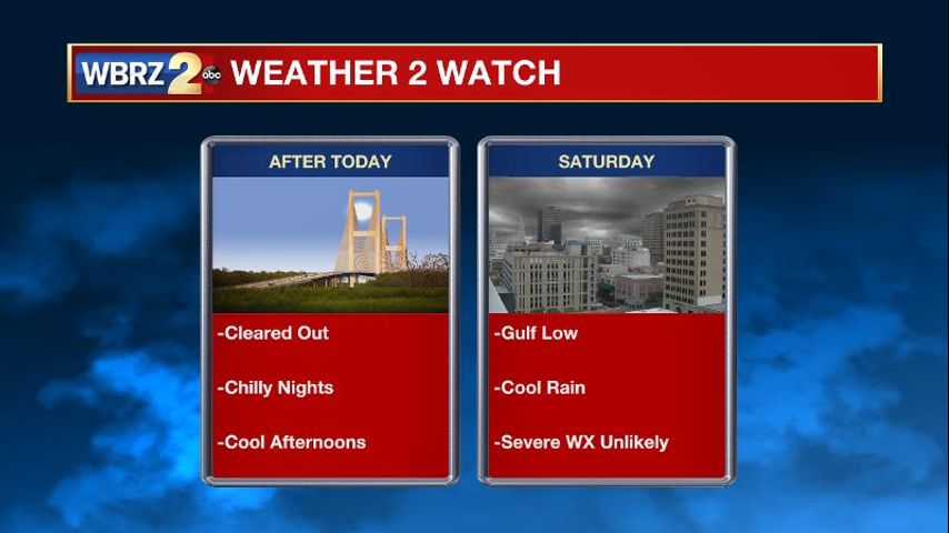 Up Next: Surface high pressure will follow closely behind the front, which will break clouds up into Wednesday. Sunny skies return through Thursday, with highs stopping in the mid to upper 50s and lows in the 30s. This weekend, a low pressure system will move across Louisiana. This will bring scattered showers through Saturday, as the low merges with a cold front from the northwest. We cannot rule out an isolated thunderstorm, but the majority of the system will just be rain. Below average temperatures will last into next week.
