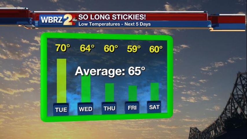 Up Next: Tomorrow Afternoon is when change will be felt in the Baton Rouge area. Temperatures will only reach the mid 80s in the afternoon and overnight lows will dip to the low 60s. Some forecast models are even showing upper 50s by midweek. This means that dry air is coming through the area which cools much more efficiently than the humid summer air we’re so accustomed to by now. Afternoons will still be warm, but not oppressively humid. Overnight, it may even be cool? That's for you to decide! Pleasant weather is expected to last right on into next weekend.